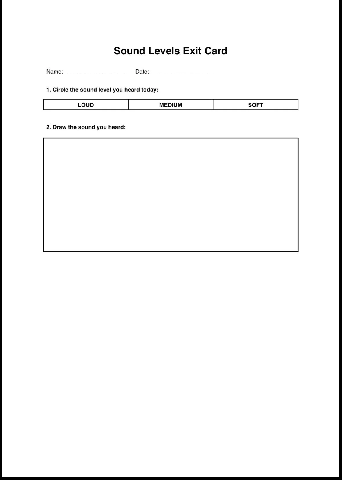 This artifact is an exit ticket used in a 3rd grade music lesson on dynamics. Students are asked to identify the sound level they heard (loud, medium, or soft) and represent their understanding by drawing the sound.
